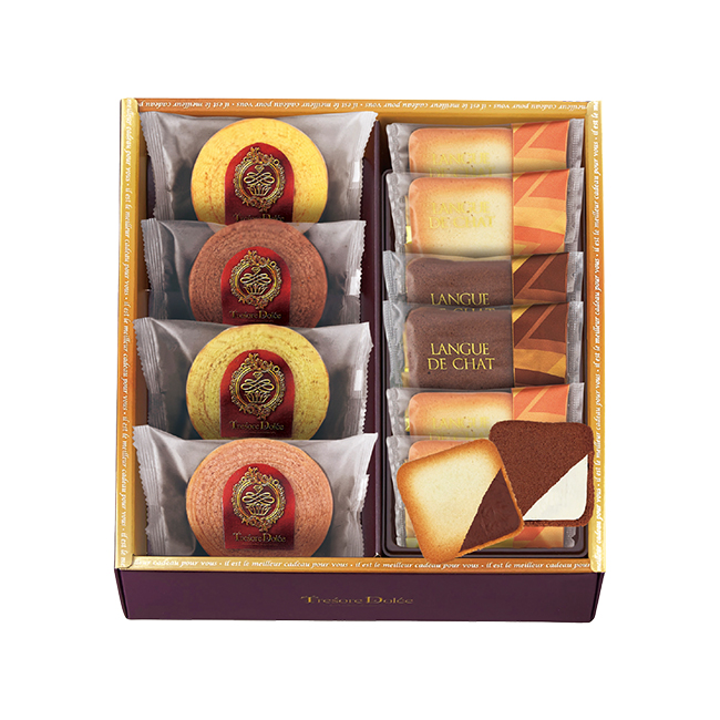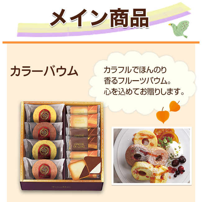 カラーバウム ●フルーツカラーバウム(ラズベリー・メロン・ショコラ・バナナ)、ラングドシャ(プレーン×4枚・チョコ×2枚)●賞味期限:製造日から120日間●生産国:日本製●アレルギー【卵・乳・小麦】●箱:22.3×19.9×6cm |