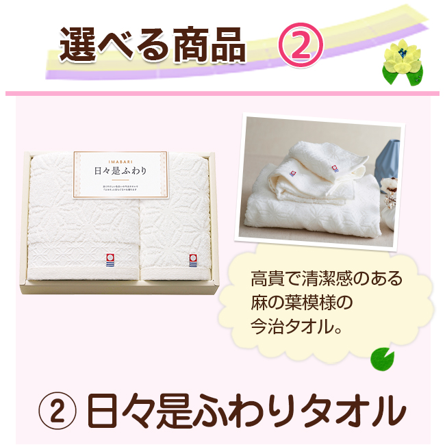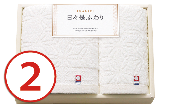 日々是ふわりタオル ●フェイスタオル(34×75cm)1P、ハンドタオル(34×30cm)1P●日本製●原材料:綿100%●化粧箱:19×26×4cm |