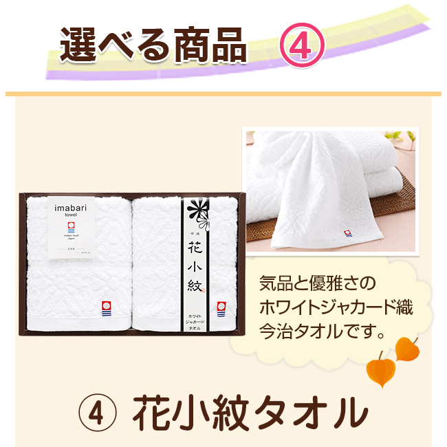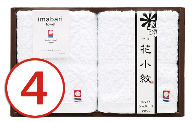 花小紋タオル ●ウォッシュタオル(約34×35cm)×2●日本製●原材料:綿100%(スリット糸使用)●化粧箱:約26×16×5cm |