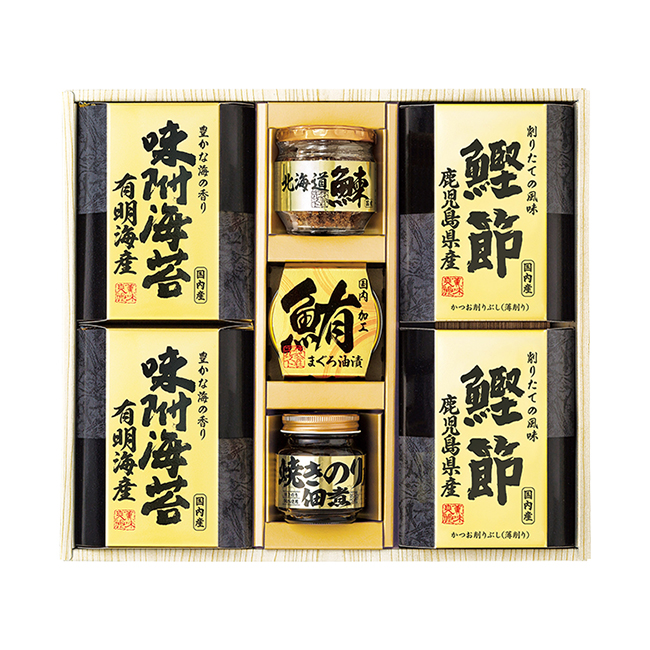 美味之誉 ●有明海産味附海苔(8切10枚)・鰹節(3袋入)各2、鰊フレーク50g・まぐろ油漬け70g・焼きのり入佃煮85g各1●加工地:日本(乾海苔/国内産)●アレルギー:【小麦・エビ】●化粧箱:約37×32×8cm |