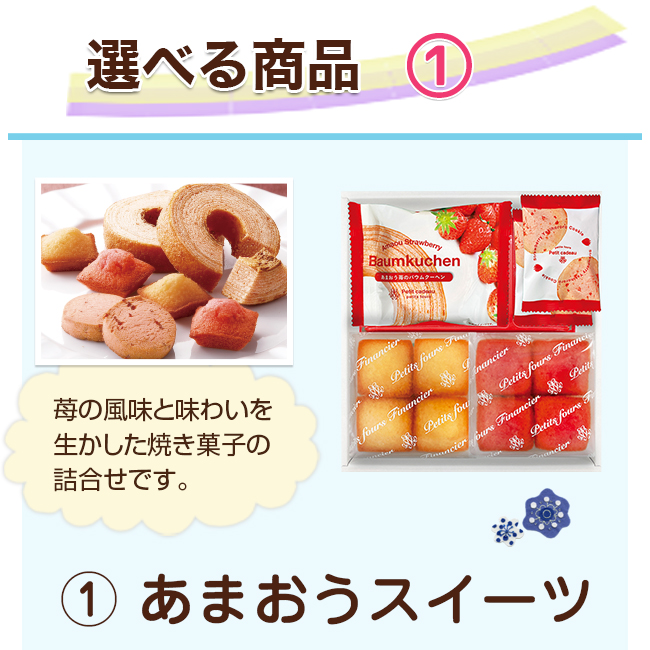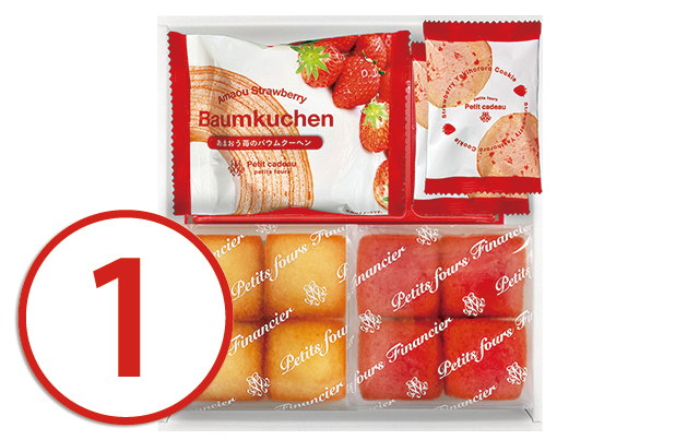 あまおうスイーツ ●あまおう苺バウムクーヘン・プチフィナンシェ4個入(あまおう苺・プレーン)×各1、焼きほろろクッキー(イチゴ)×2●賞味期限:製造日より90日●加工地:日本●アレルギー:【小麦・卵・乳】●化粧箱:20.2×19×5cm |