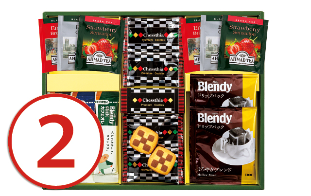 コーヒーギフト ●チェスティアクッキー×4、AGFブレンディコーヒードリップ式7g・紅茶(アールグレイ・イングリッシュブレックファースト・ストロベリー)2g×各2、AGFブレンディスティック(エスプレッソ・オレ6.2g・カフェオレカロリーハーフ5.4g・カフェオレ8.8g)×各1●賞味期限:製造日より180日●加工地:日本●アレルギー:【小麦・卵・乳】●化粧箱:26×32.5×4cm |