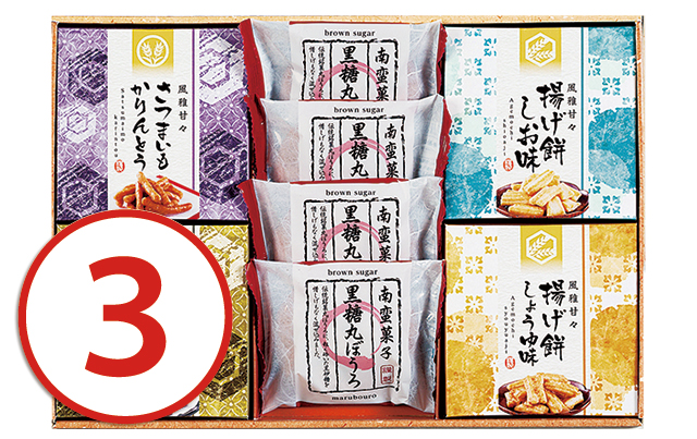 和菓子詰合せ ●黒糖丸ぼうろ×4、揚げ餅(しお味・しょうゆ味)20g・かりんとう(さつまいも・黒糖)30g×各1●賞味期限:製造日より120日●加工地:日本●アレルギー:【小麦・卵】●化粧箱:約23×32.5×4cm |