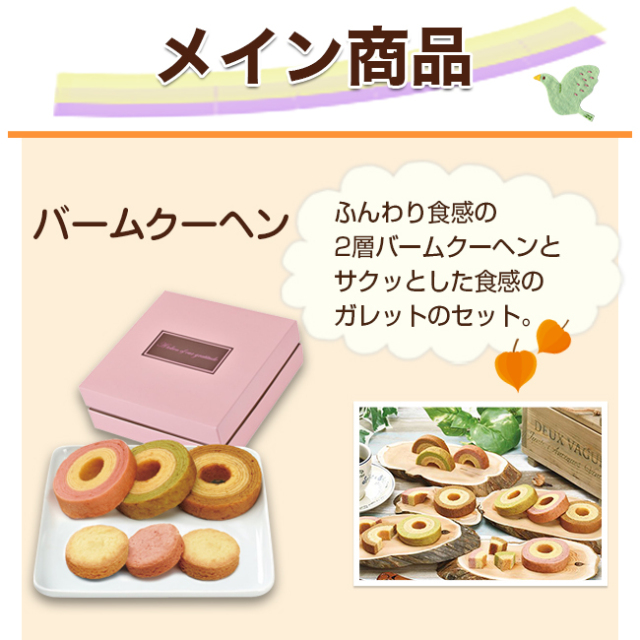 バームクーヘン ●2層バウムクーヘン(キャラメル&ミルク・ストロベリー&ミルク・抹茶&ミルク)×各1、マドレーヌ×2●賞味期限:製造日から25日間●化粧箱:16×16×6cm●アレルギー【小麦・卵・乳成分】 |