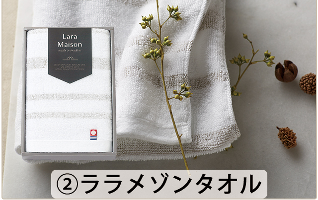 ララメゾンタオル ●フェイスタオル(34×75cm)●日本製●材質:綿100%●化粧箱:約22×15×2cm |