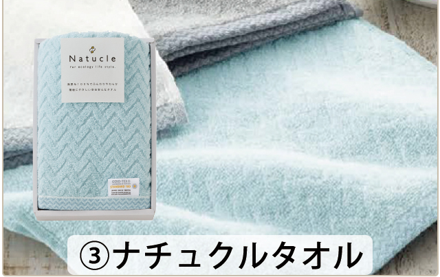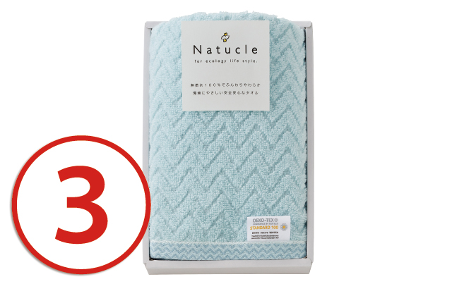 ナチュクルタオル ●フェイスタオル(34×80cm)●中国製●材質:綿100%●化粧箱:約16×24×3.5cm |