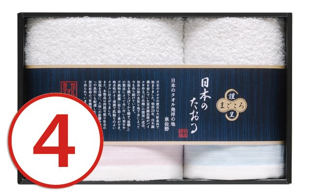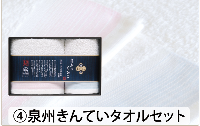 泉州きんていタオルセット ●フェイスタオル(約29×75cm)・ハンドタオル(約29×29cm)各1●日本製●材質:綿100%●化粧箱:約24.5×15.5×4cm |