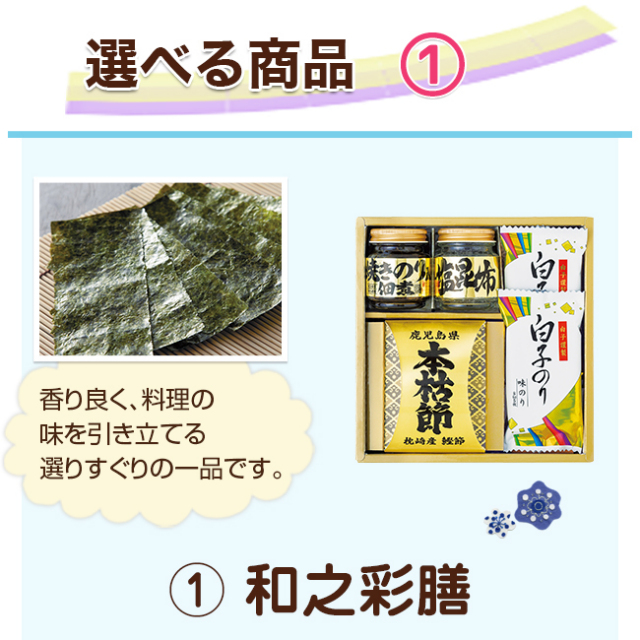 和之彩膳 ●白子のり味のり(8切5枚)×2、枕崎産鰹本枯れ節(2袋入)・塩昆布18g・焼きのり入佃煮85g各1●加工地:日本(乾海苔/国内産)●アレルギー:【小麦・エビ】●化粧箱:約22.5×22×7cm |