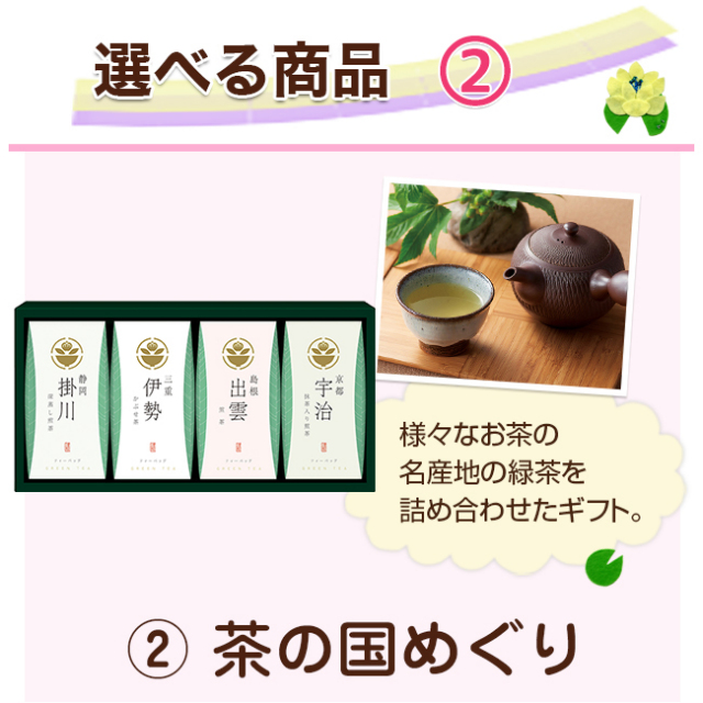 茶の国めぐり ●静岡 掛川深蒸し煎茶ティーバッグ(5袋)・三重 伊勢かぶせ茶ティーバッグ(5袋)・島根 出雲煎茶ティーバッグ(5袋)・京都 宇治抹茶入煎茶ティーバッグ(5袋)各1●賞味期限:製造日より360日●茶葉原産地:日本●化粧箱:約30.8×15.7×5.3cm |