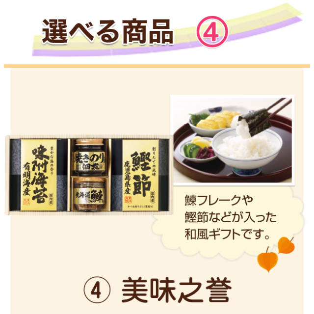 美味之誉 ●北海道産鰊フレーク50g・焼きのり佃煮85g・鹿児島県産鰹節(2g×3)・有明海産味附海苔(8切10枚)×各1●加工地:日本●アレルギー:【小麦・えび】●化粧箱:16.5×35×7cm |